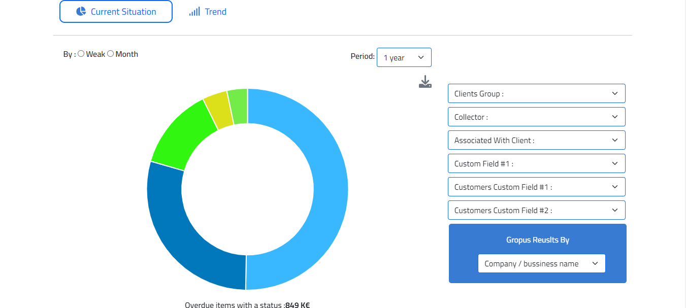 It displays by default the breakdown of overdue receivable by type of status: litigation, ongoing, promise to pay, dispute, dispute resolved: